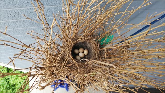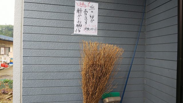 家の玄関先の竹ぼうきの中に卵が5つ・・・。