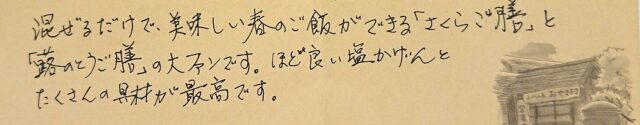 どちらも竹の子やレンコン、キノコ等と混ぜ合わせており、風味や食感もお楽しみいただけます。