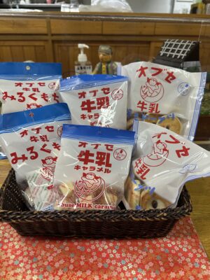 りんごジュース5種類、えんめい茶、そしてオブセ牛乳様のみるくもちと焼ドーナツです。