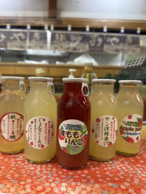 りんごジュース5種類、えんめい茶、そしてオブセ牛乳様のみるくもちと焼ドーナツです。
