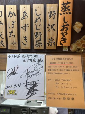ゲストはEXILEのTAKAHIRO様、オードリーの春日様、マヂカルラブリーの村上様が来てくれて、いろりで野沢菜とあずきとなすを召し上がってくれました。