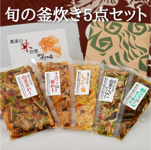 ちょっとしたおつかいものに最適。「山菜釜めし、きのこ釜めし、山菜きのこちらし、しょうがご膳、野沢菜ちりめん」各1袋をセットにしました※従来品からパッケージ変更によりお求めやすい価格になりました