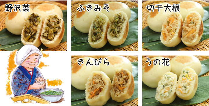 ●内容量/野沢菜おやき2個、ふきみそおやき2個、切干大根おやき2個、きんぴらおやき2個、卯の花おやき2個