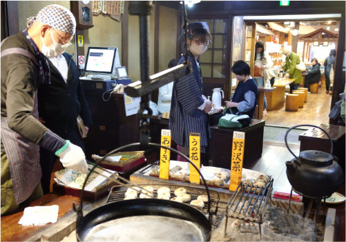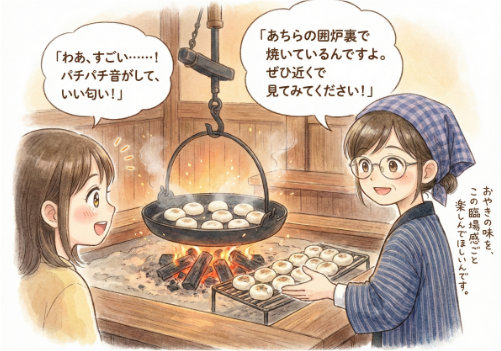 特に大門店には囲炉裏があるので、「あちらで焼いているんですよ、ぜひ行ってみてください」とご案内しています。