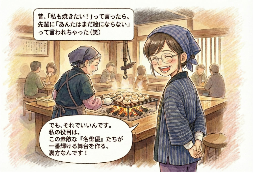 囲炉裏の前に座るお母さんたちの姿は、本当にお店に馴染んでいて素敵なんですよね。私は店長として、そんな「俳優さん」のようなスタッフたちが輝けるように、裏方でしっかり支える「縁の下の力持ち」でありたいと思っています。