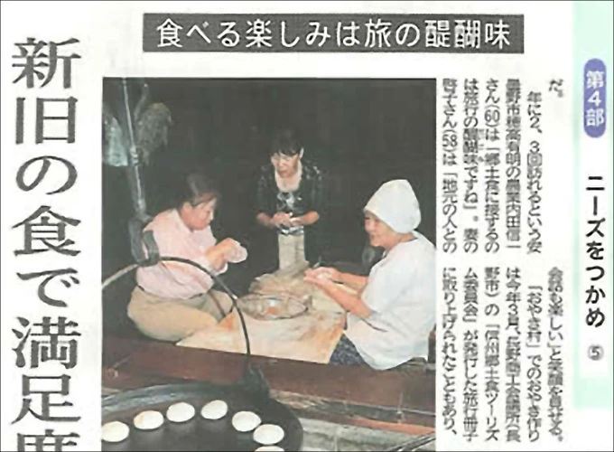 おやき作り体験、手打ちそばや食事の提供、契約農家さんと畑の管理や原料の手配。「おやき村」や長野市にある「おやき村大門店」などと連携します。